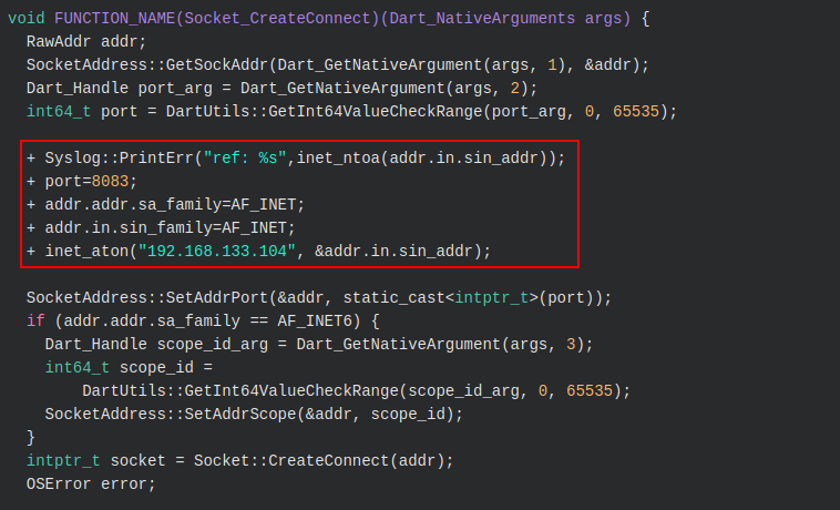 Since the Flutter framework does not respect the Android device’s proxy settings, the reFlutter tool also holds logic to adjust the Dart SDK’s Socket creation logic (socket.cc) to force a proxy: