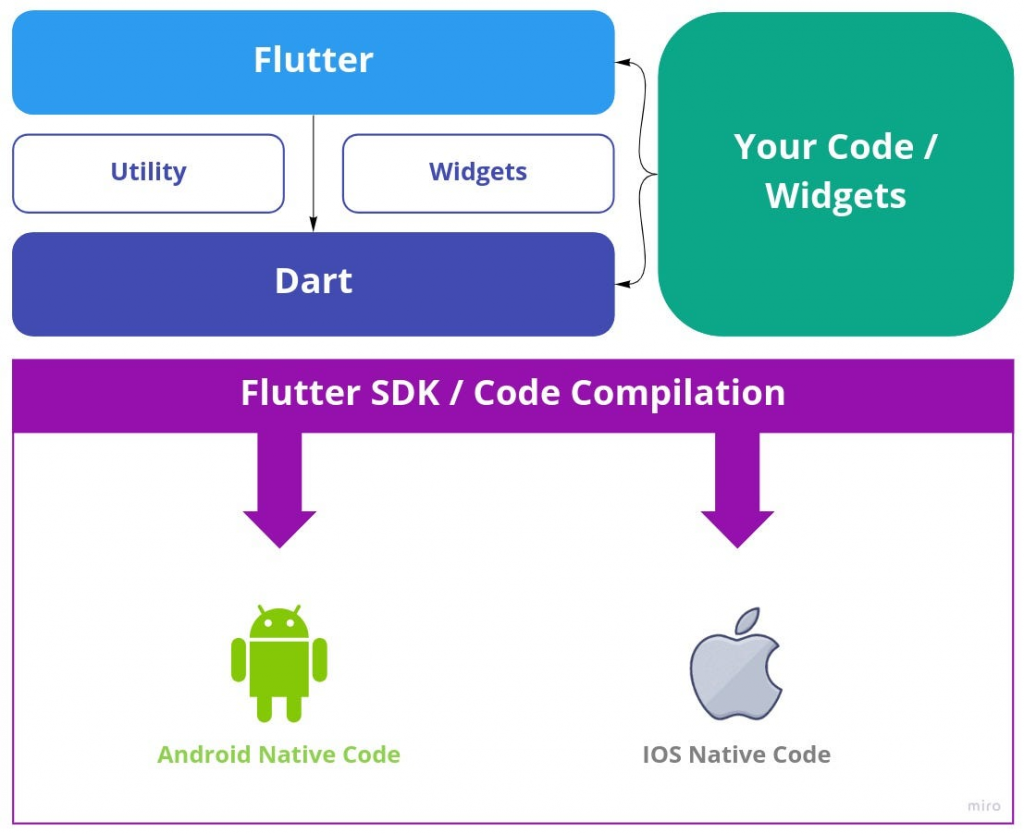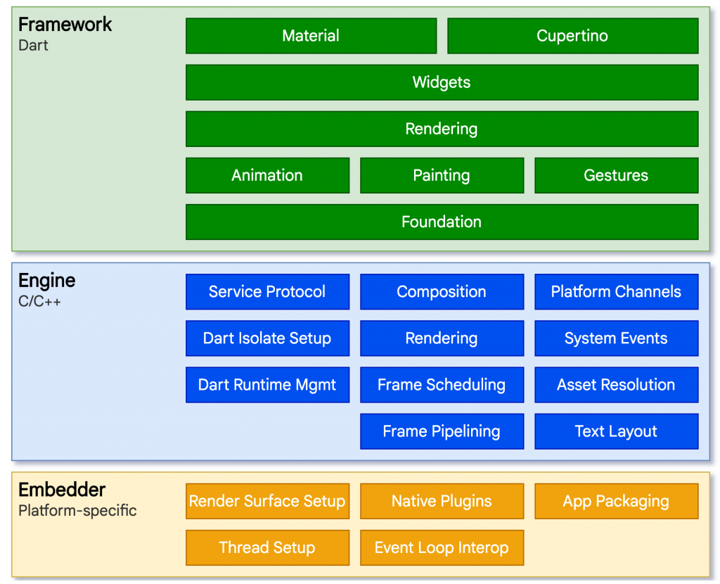 Using Android as an example, the Flutter application would be written in Dart. Since Android does not natively run Dart, the Framework instructions will get forwarded to the Engine. The Engine then contains a Dart VM, which converts those instructions to Java, which finally gets executed by Android underneath.