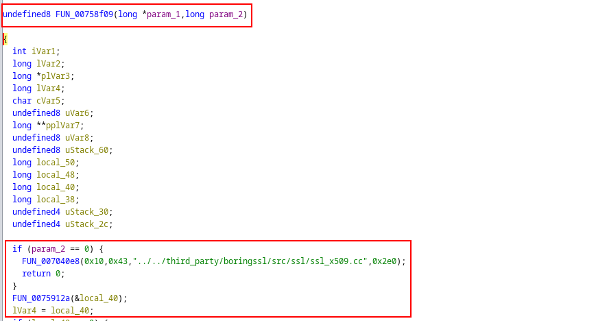 Back in Ghidra, I searched for string reference to the ssl_x509.cc file: