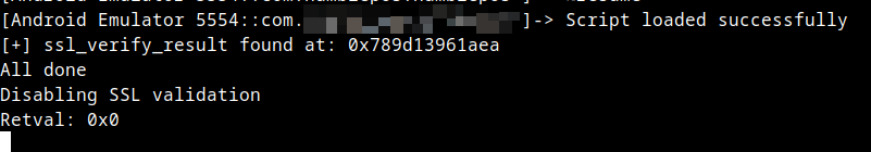 Back in the Frida console, we notice that the hooked function originally would have returned a 0x1 response, but our script modified it such that it returned 0x0 instead: