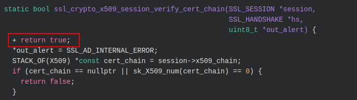 Tracing the replacement logic, the earlier ssl_crypto_x509_session_verify_cert_chain function would be adjusted as follows: