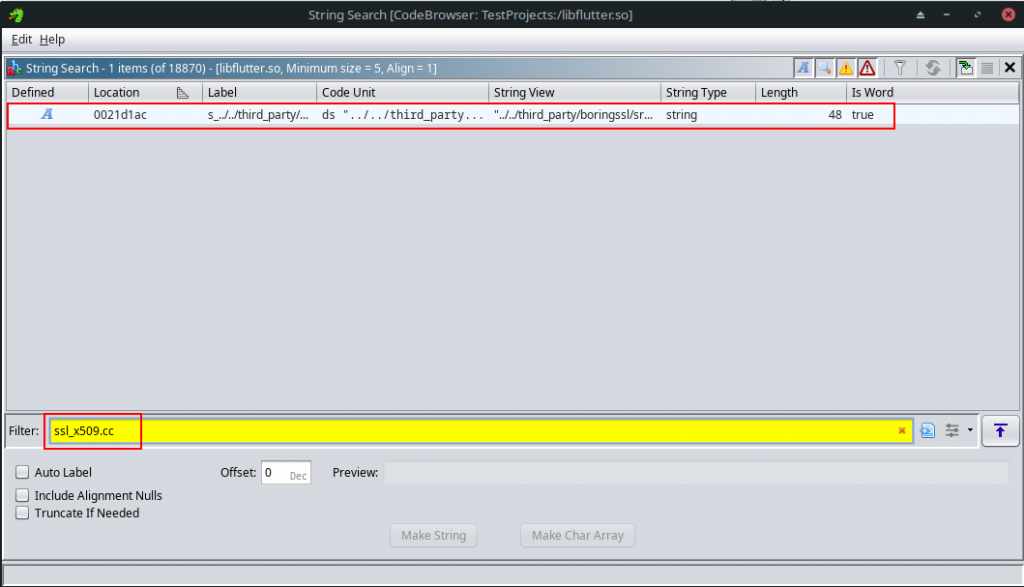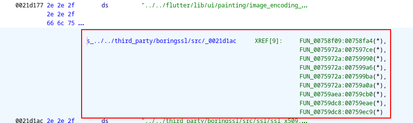 Unfortunately, identifying the function turned into quite the exercise. Remember the libflutter.so file is stripped, which means no symbols are available. For example, this is the output Ghidra showed when navigating to a cross-reference of the ssl_x509.cc file: