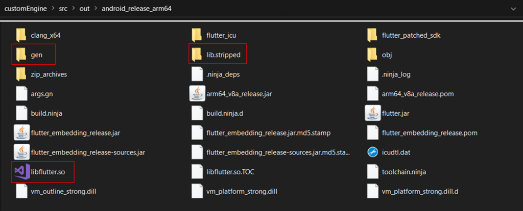 Here, all the files needed to create a Flutter snapshot can be found: artifacts, flutter_patched_sdk_product, and gen_snapshot. The lib.stripped folder contains the libflutter.so engine, which will be copied into a folder with libapp.so during the compilation of the APK.