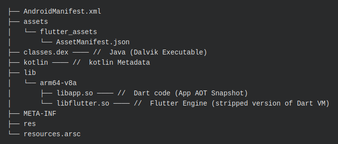 As seen in the section above, Android Flutter-based applications are largely driven by the two shared libraries: libapp.so and libflutter.so.