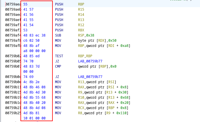 Afterwards, with the function identified, I could use Ghidra to capture the first few assembly instructions that (hopefully) uniquely identified the function in memory: