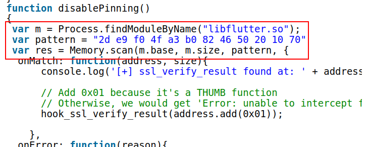 Out of ideas, I revisited my earlier Google searches. In doing so, I came across references to two public blog posts from 2019 and 2020 where Jeroen Beckers had bypassed the SSL certificate pinning in Flutter using Frida. Reviewing those blog posts, I realised that Jeroen was using memory pattern matching to grab the specific functions (i.e. ssl_verify_result) from within the libflutter.so module: